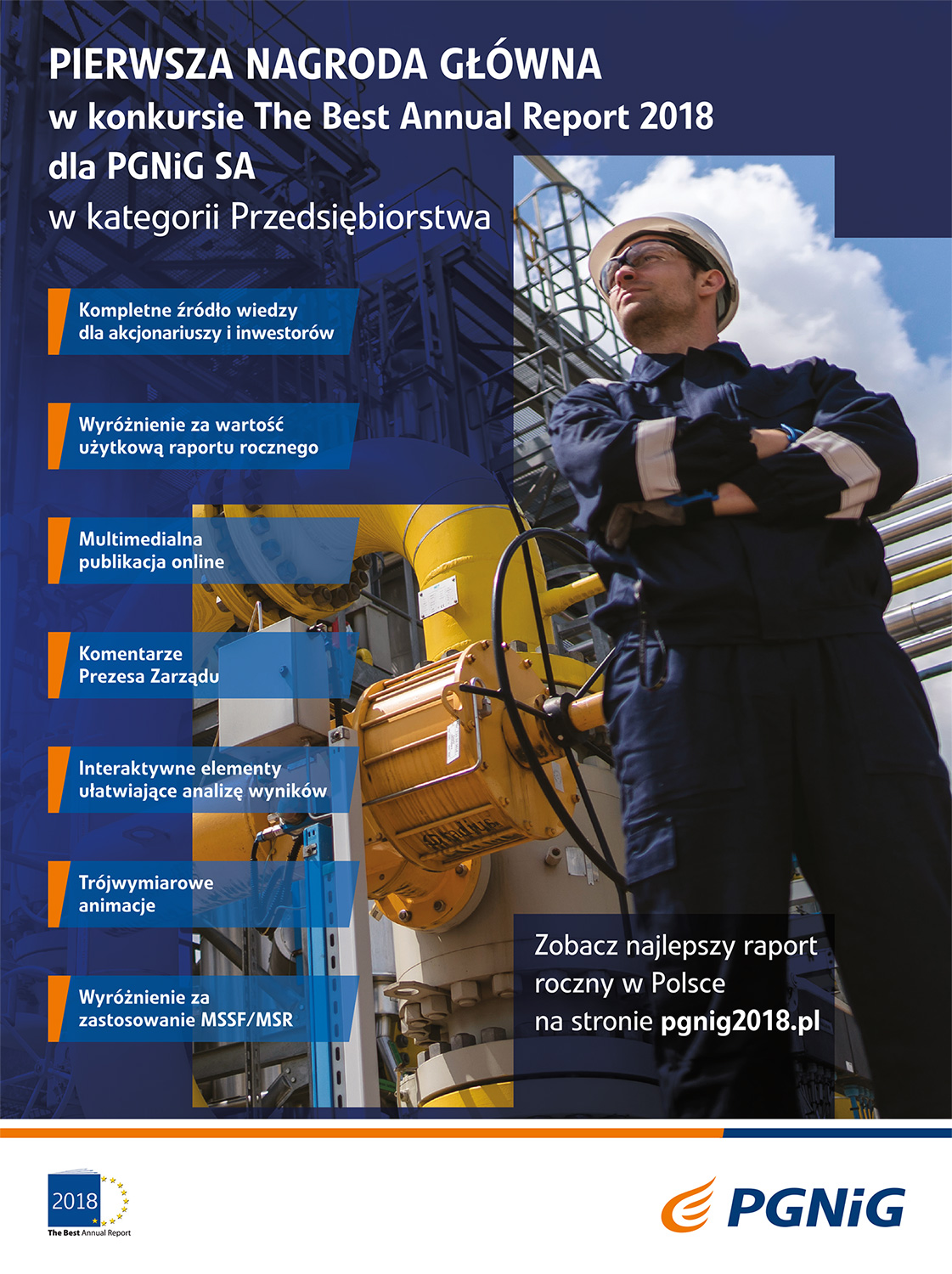 Raport Roczny PGNiG otrzymał Pierwszą Nagrodą Główną w konkursie „The Best Annual Report” w kategorii „Przedsiębiorstwa” za 2018 rok. Grupa otrzymała również wyróżnienia za najlepszą wartość użytkową raportu dla akcjonariuszy i inwestorów oraz za najlepsze zastosowanie standardów MSSF/MSR. Nagrody już po raz czternasty przyznał Instytut Rachunkowości i Podatków (IRiP).
