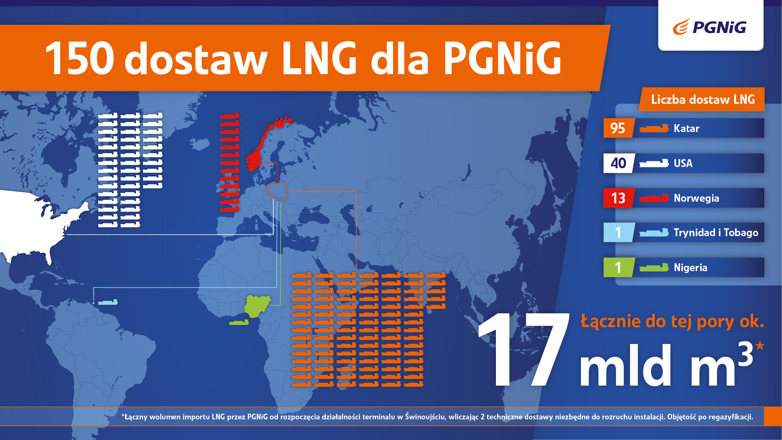 W ramach 150 dostaw odebranych przez PGNiG od początku funkcjonowania Terminalu LNG im. Prezydenta Lecha Kaczyńskiego w Świnoujściu 95 pochodziło z Kataru, 40 z USA, 13 z Norwegii, a po jednej z Trynidadu i Tobago oraz z Nigerii.