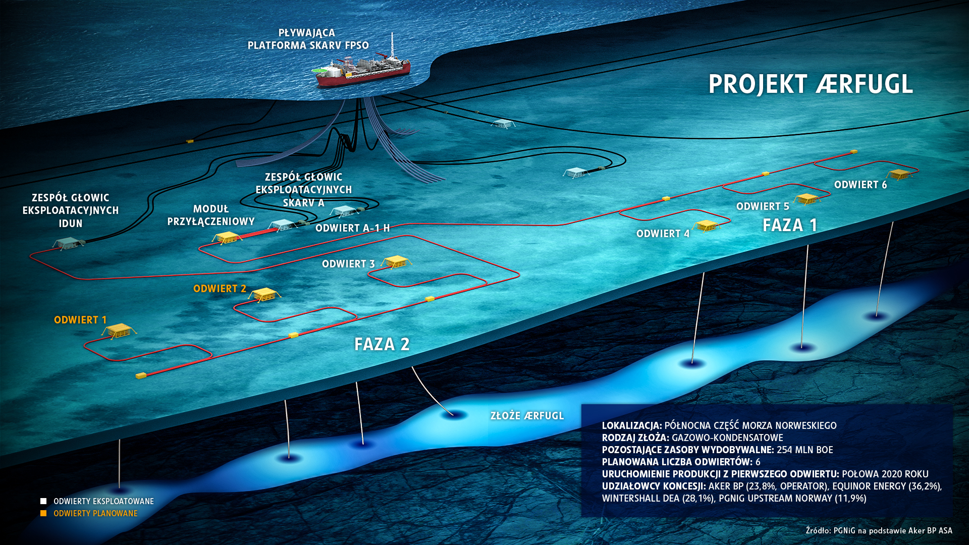 Plan zagospodarowania złoża Ærfugl przewiduje wykonanie sześciu odwiertów produkcyjnych w ramach dwóch faz inwestycji – w każdej zaplanowano po trzy otwory. W kwietniu tego roku uruchomiono pierwszy odwiert w ramach Fazy II zagospodarowania. Pozostałe dwa zostaną oddane do użytku w 2021 roku – dwa lata wcześniej niż pierwotnie zakładano. Po zrealizowaniu całego planu zagospodarowania koncesji, roczna produkcja ze złoża Ærfugl przypadająca na norweską spółkę PGNiG będzie wynosić w szczytowym okresie 0,5 mld m sześc. gazu. Paliwo to trafi do Polski dzięki budowanemu gazociągowi Baltic Pipe.
